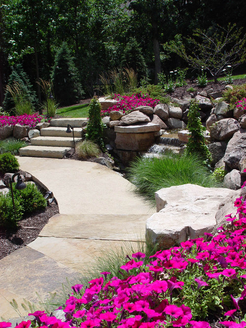 This water feature is unexpectedly but effectively tucked along a walkway made of oversized stone slabs. It utilizes the natural slope of the property for height and creates a soothing sound that invites visitors to explore the back lawn. Spiky grasses and masses of bright annuals add interest while natural stone boulders delineate the waterfall and create texture.